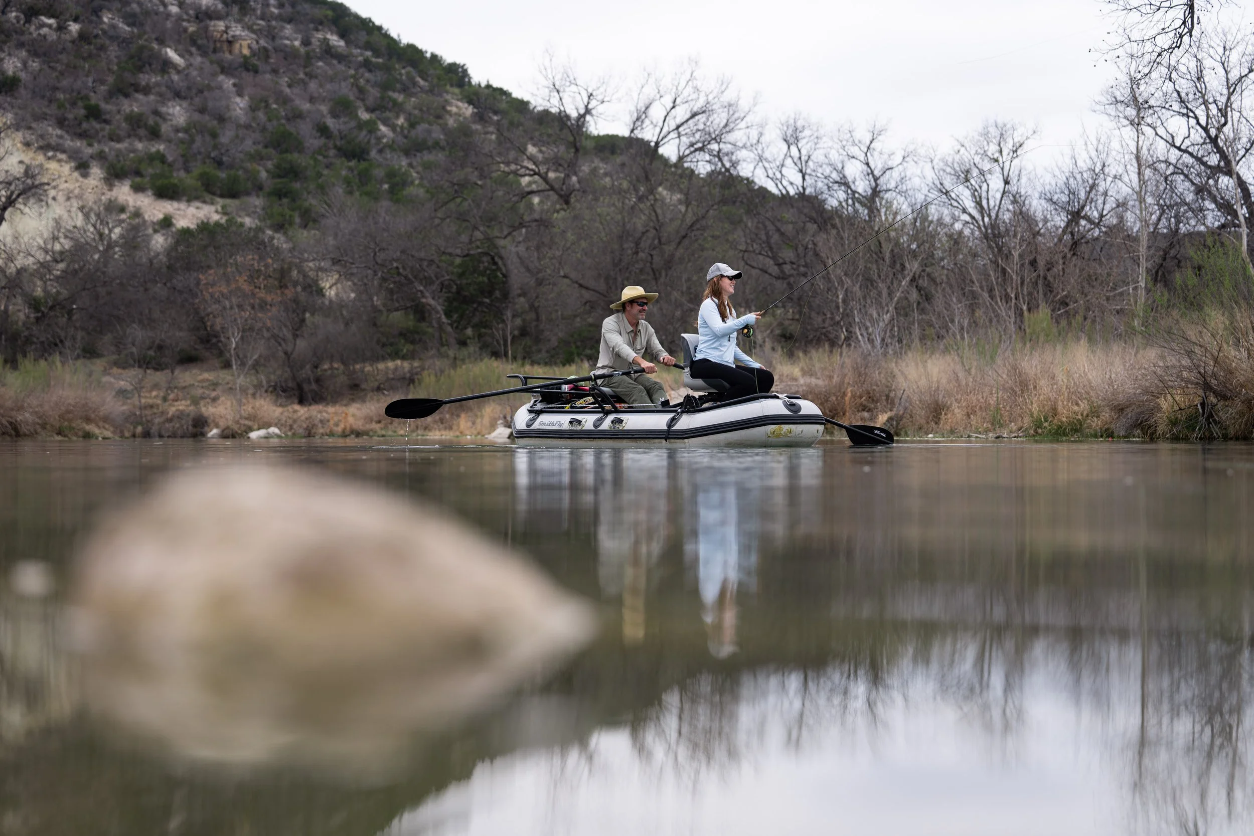 Texas is primarily a “wet wade” state, meaning that our water temperatures do not require the use of waders for the majority of the year. Dress in quick-drying long sleeve shirts and pants [no jeans please!] with proper wading footwear. Polarized sunglasses, a hat, and sunscreen are necessary as well.